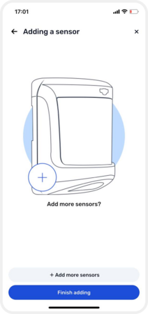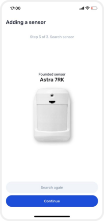 Prepare the sensor and the battery, and keep them close to the hub. In the app, tap Start search — the hub will switch to pairing mode.